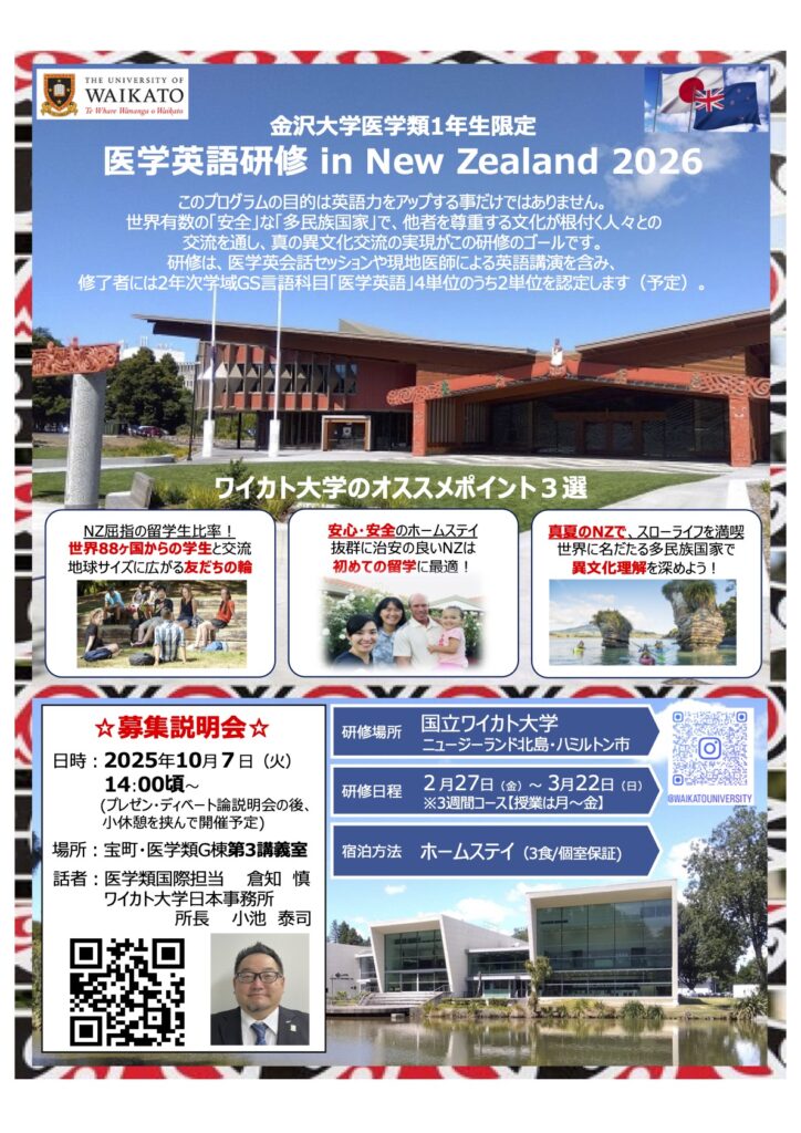 医学類1年生春休み(2月末〜3月中旬)を利用して、ニュージーランド国立ワイカト大学内にあるワイカト・カレッジへ3週間短期留学して、医学英語を学びます。また、短期留学中はワイカト大学の登録ファミリー宅にホームステイをし、現地の生活を経験します。追加料金がかかりますが、滞在期間中にロトルアなどを訪問する機会もあります。10月に説明会と募集を行います。条件を満たした場合、JASSO の給付型奨学金を受給することができます。